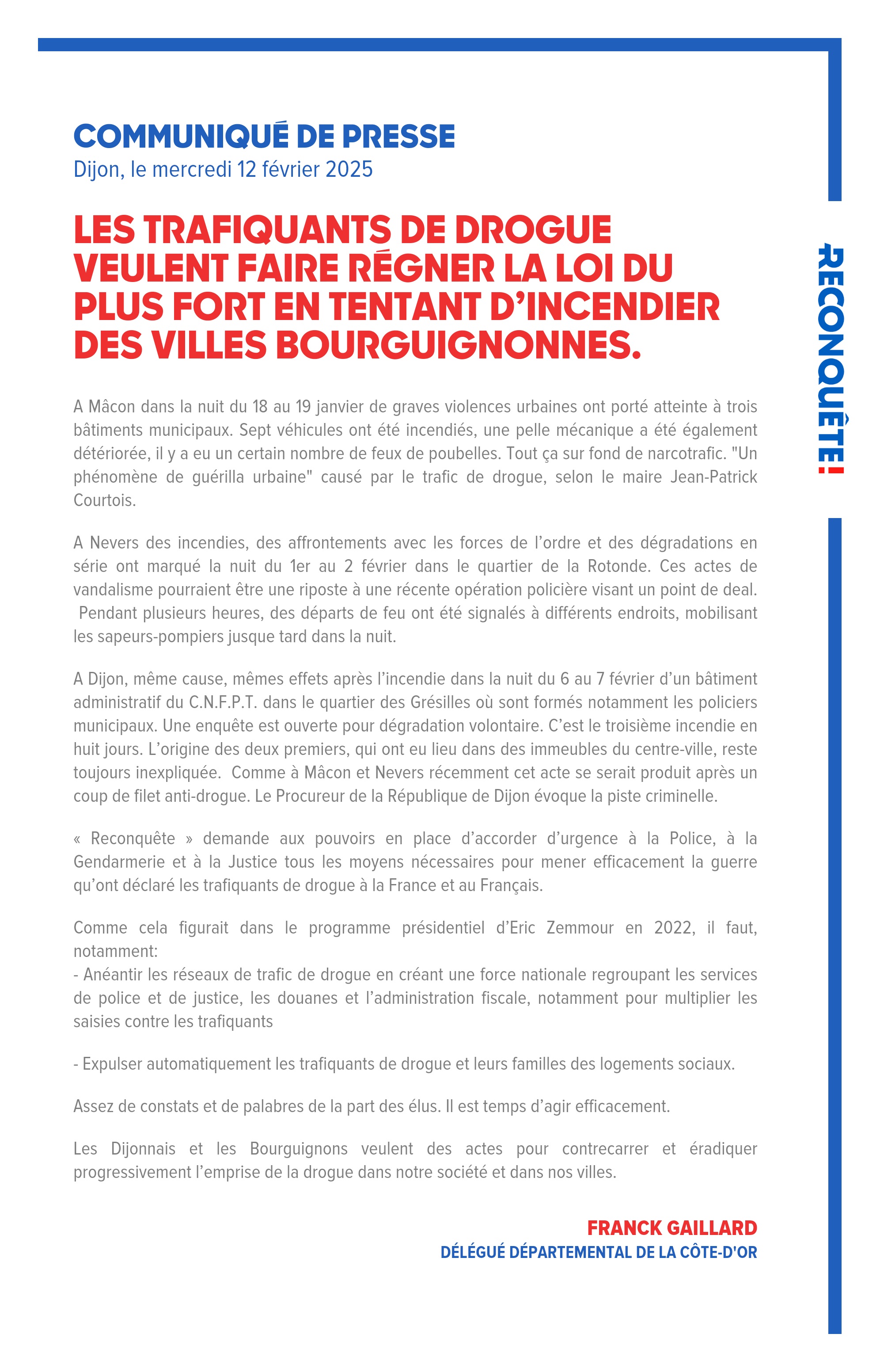 « Reconquête » demande aux pouvoirs en place d’accorder d’urgence à la Police, à la Gendarmerie et à la Justice tous les moyens nécessaires pour mener efficacement la guerre qu’ont déclaré les trafiquants de drogue à la France et au Français.