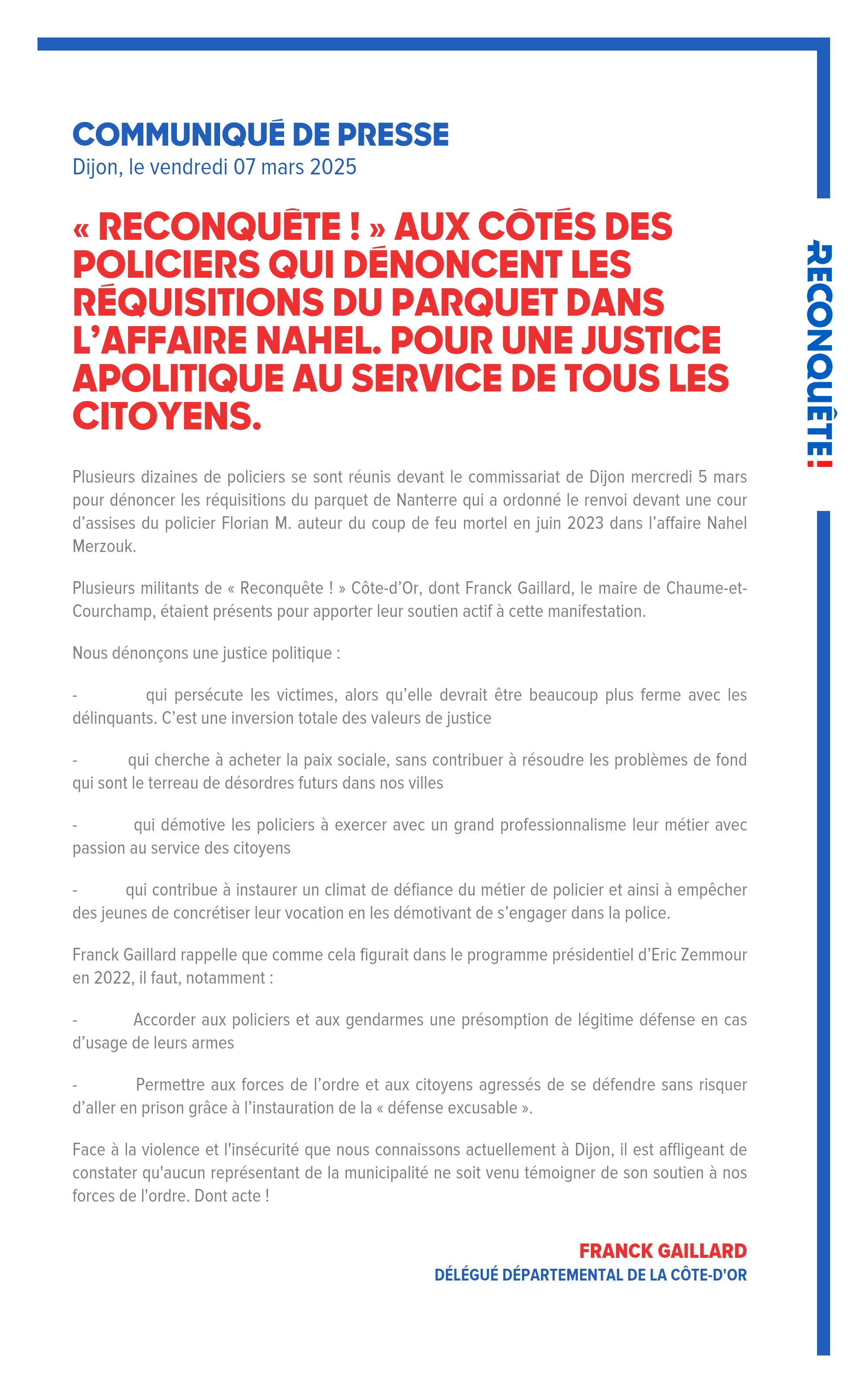 « Reconquête ! » aux côtés des policiers qui dénoncent les réquisitions du parquet dans l’affaire Nahel. Pour une Justice apolitique au service de tous les citoyens.